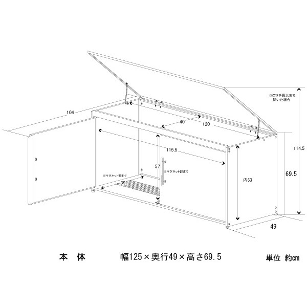 | サイズ | 本体:約横幅125cm×奥行49cm×高さ69.5cm 内寸:約横幅120cm奥行41.5cm×高さ63cm 梱包サイズ:約126cm×66cm×9cm |