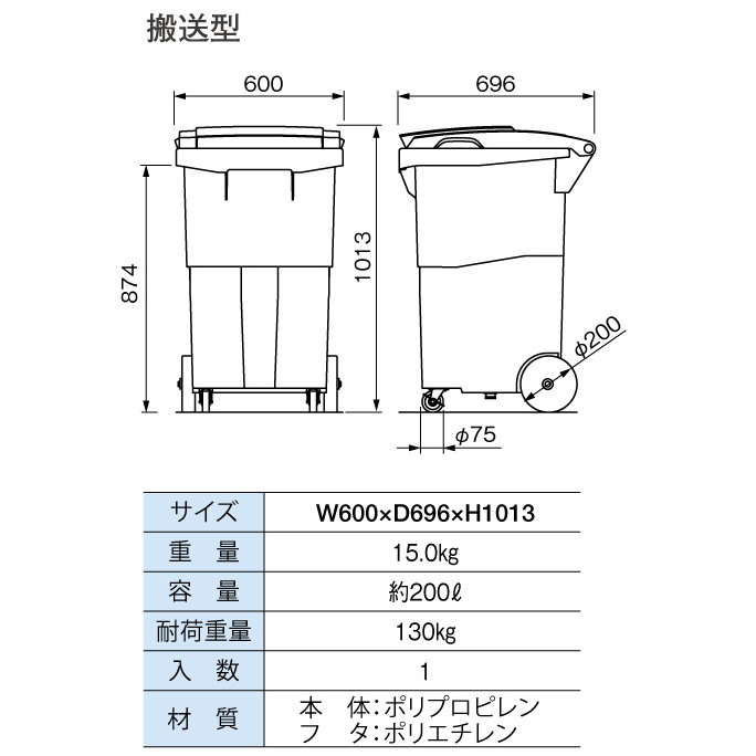 ●分別収集に便利なカラーバリエーション。オプションも豊富な搬送カート。容量は200リットルです。