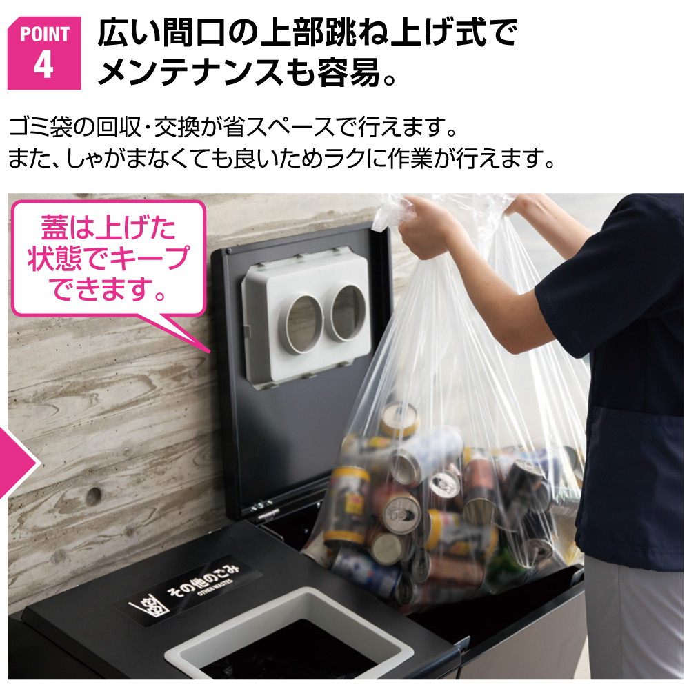 ●ゴミ袋が簡単に交換できる跳ね上げ開閉式タイプです。