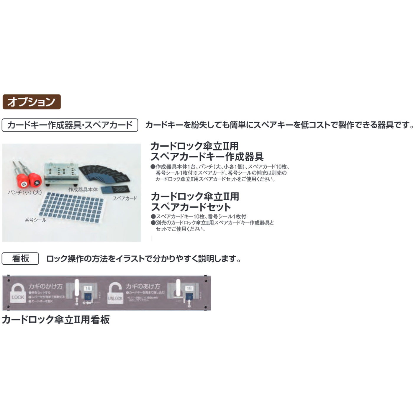 ・組立式です。お客様にて組立をお願いします。 ・マスターキーは3枚、カードキーは各番号につき3枚付属しております。 ・オプションで使用方法説明の看板を付ける事が出来ますのでお問い合わせください。(別途料金) ・カギを紛失した場合にはカードロック傘立Ⅱ用スペアカードキー作成器具を使用して自分で作成できます。(別途料金) ・商品の色はPCと異なって見える場合があり、またPCによっても異なります。色がイメージと異なるという理由では返品は承りかねますので、予めご了承ください。 |