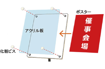 ポスターの交換は、四隅の化粧ビスを取り外し、面板とアクリルカバーの間にポスターをセットして化粧ビスを留めるだけです。