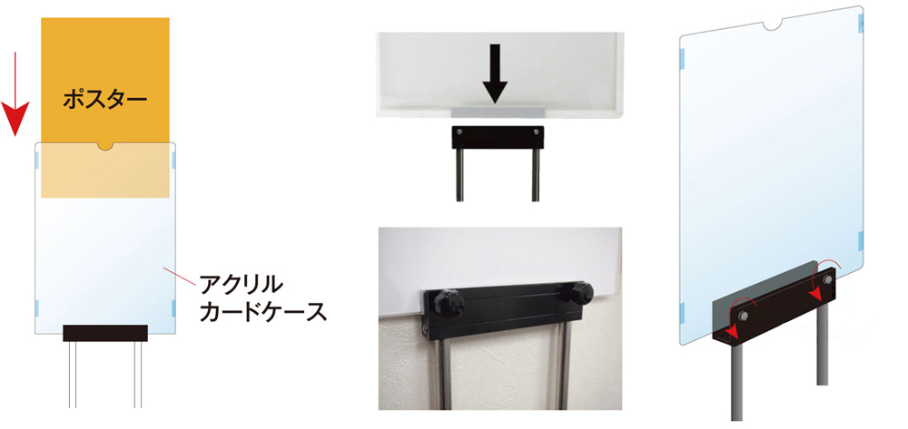 ポスターの交換は、アクリルケースの上からポスターを入れ、アクリルケースの補強バーの部分をスタンド本体に差し込みます。最後に本体背面のボルトを緩め、アクリルケースを固定すると完成です。