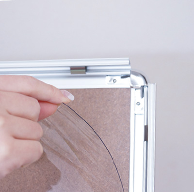 ポスターの交換は、四辺のフレームを空け、透明カバーを外してポスターをセットし、再び透明カバーを入れて四辺のフレームを閉めるだけです。