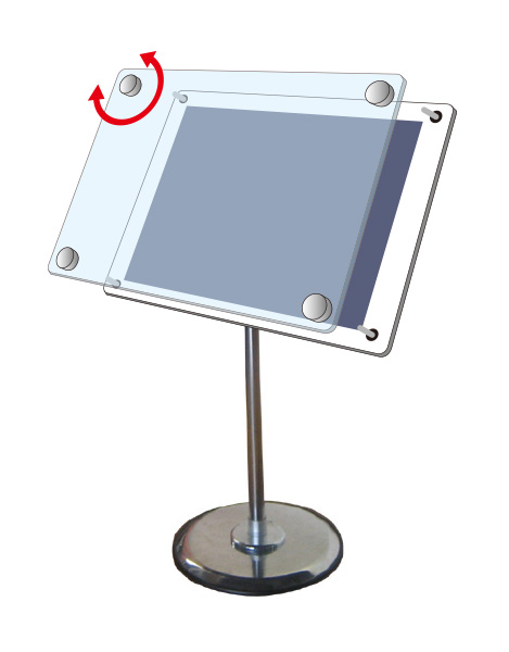 展示パネルが360度回転し、自由な向きでポスターを展示できます。また展示角度も0〜50度まで調節可能。展示向きや角度の調節は、パネル背面のグリップボルトを緩めるだけなので、工具も必要なく非常に簡単です。