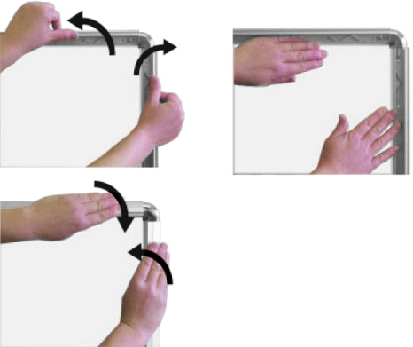 ポスターの交換は、四辺のフレームを空け、透明カバーを外してポスターをセットし、再び透明カバーを入れて四辺のフレームを閉めるだけです。