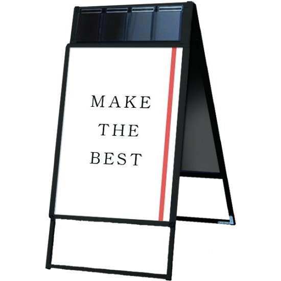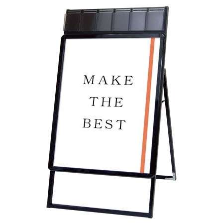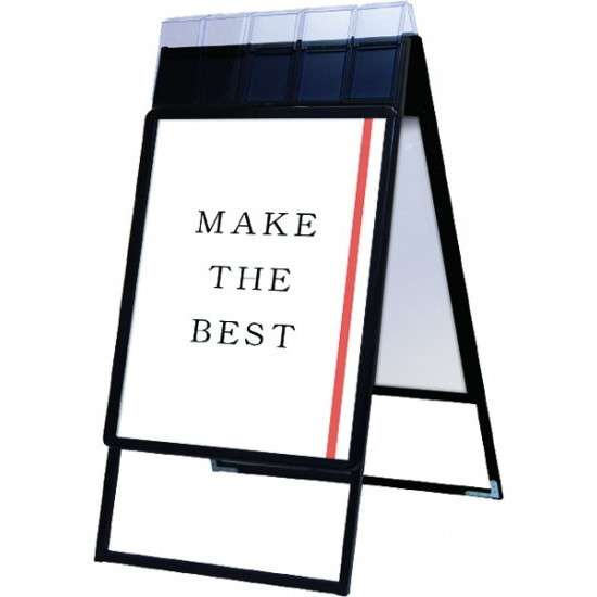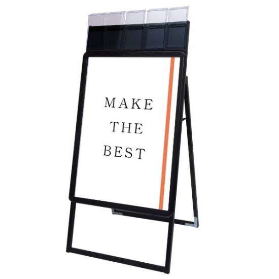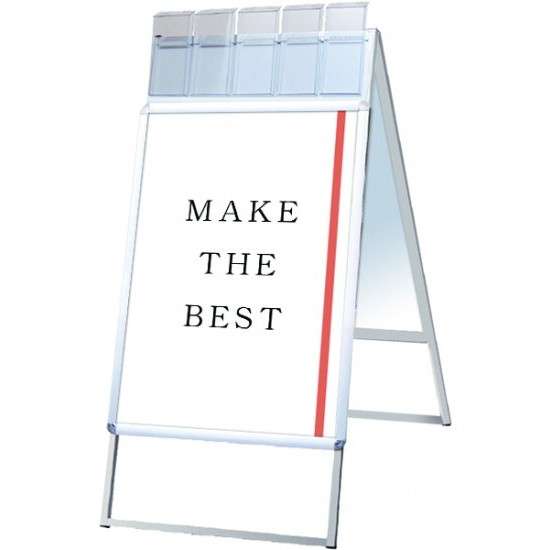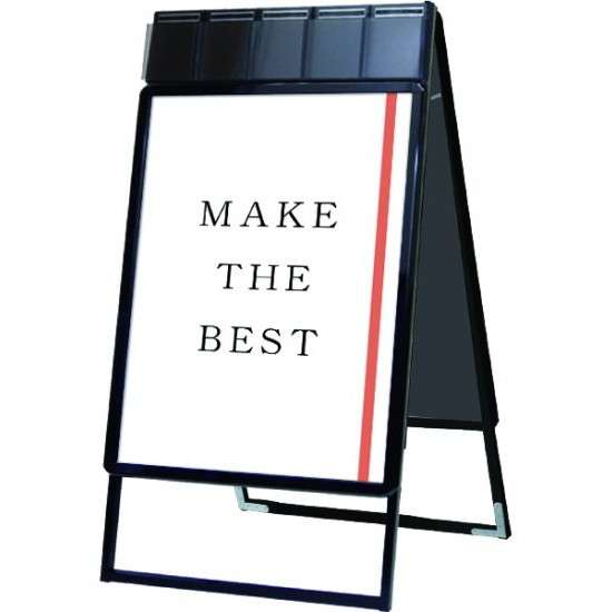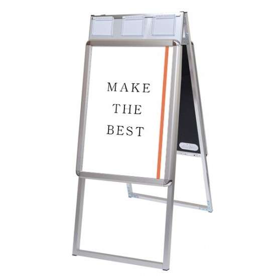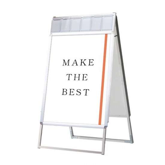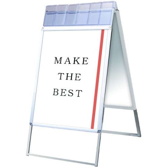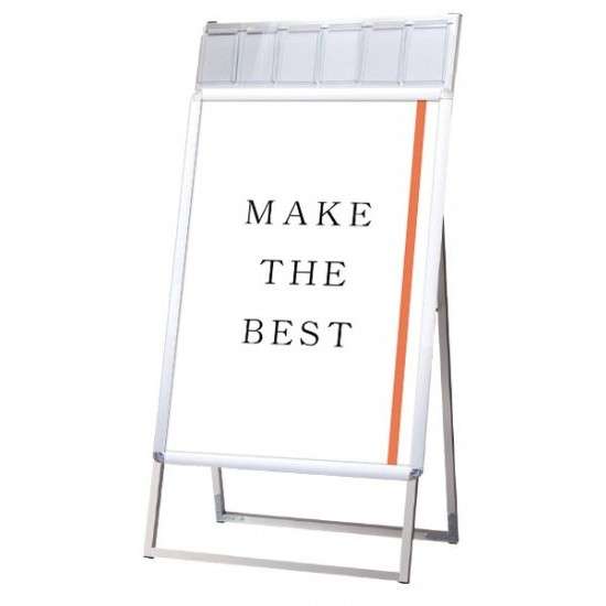 常磐精工のポスターグリップ スタンド看板パンフレットケース付はA4三つ折りパンフレットを配布できるケースが付いた四辺開閉式のスタンド看板です。