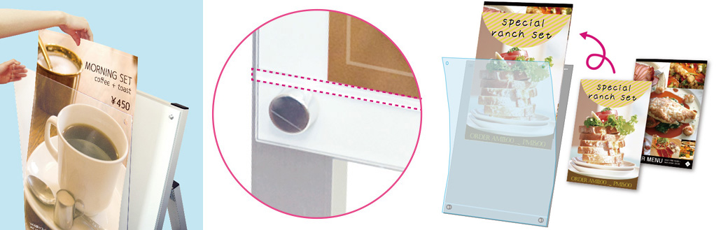 TOKISEIオリジナルのポスター交換機構『マグネロック』(特許取得済み)により約10秒でポスターを交換できます。