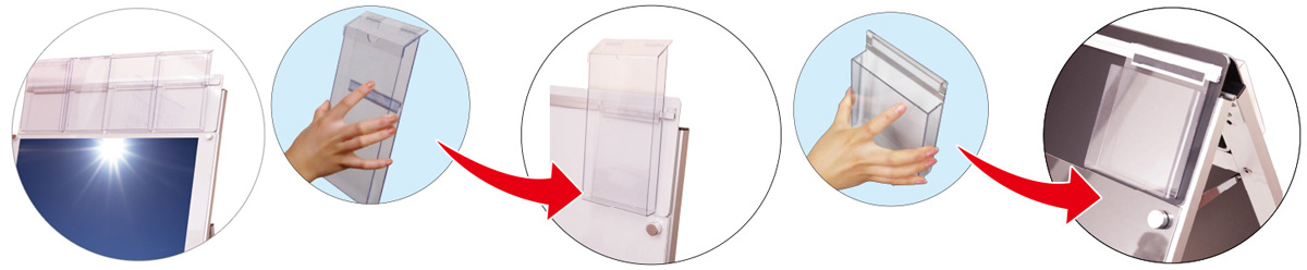 A4サイズを3つ折りにしたパンフレットがぴったり入る透明ケースが付属しています。屋外用は雨を防ぐフタ付ケースになっています。(防水仕様ではありません)またケースは脱着式になっているので、もしケースが破損してもケースのみ購入して頂き、取り換え可能です。
