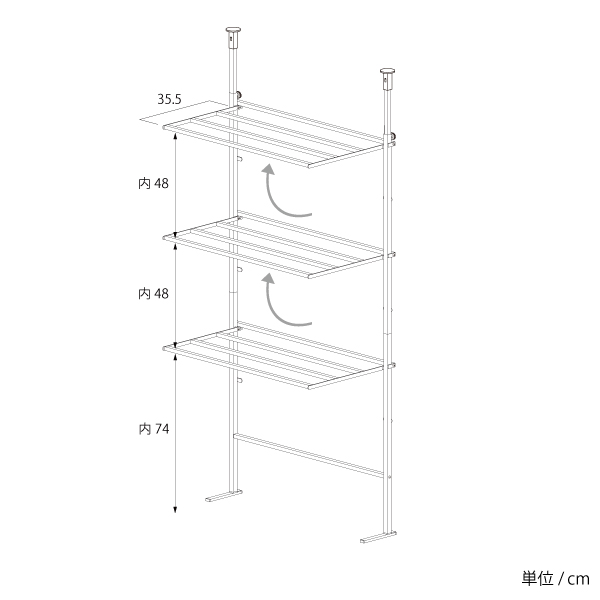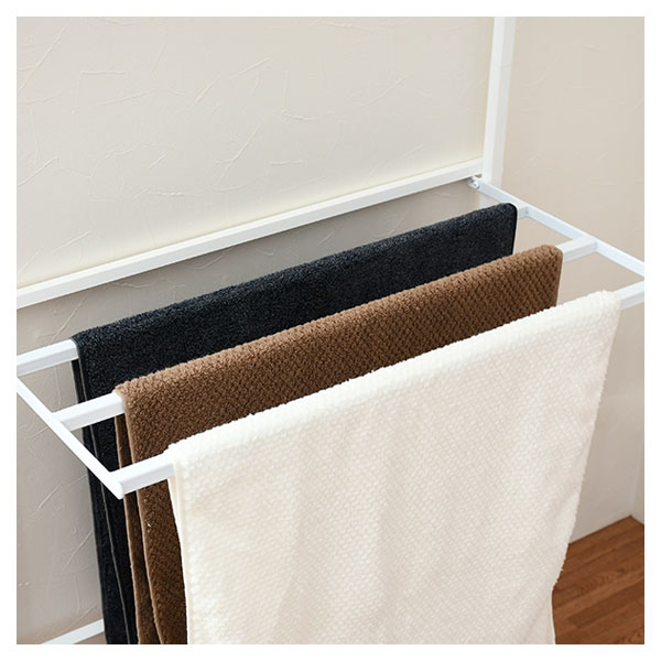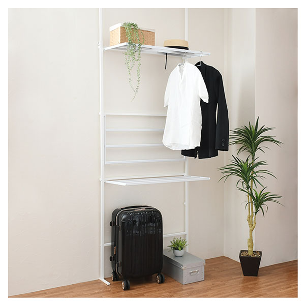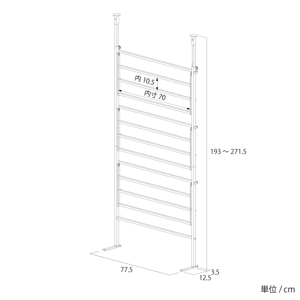 | サイズ | ハンガー未使用時 : 横幅77.5cm × 奥行16cm × 高さ193 〜 271.5cm ハンガー使用時 : 横幅77.5cm × 奥行39cm × 高さ193 〜 271.5cm 梱包時 : 約98cm × 40cm × 8cm |