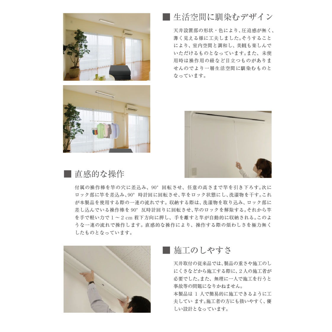●生活空間との融合を追求したデザイン、簡単な施工で取りつけることができる室内物干しです。