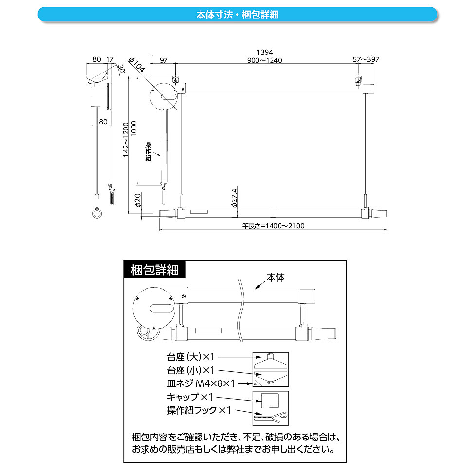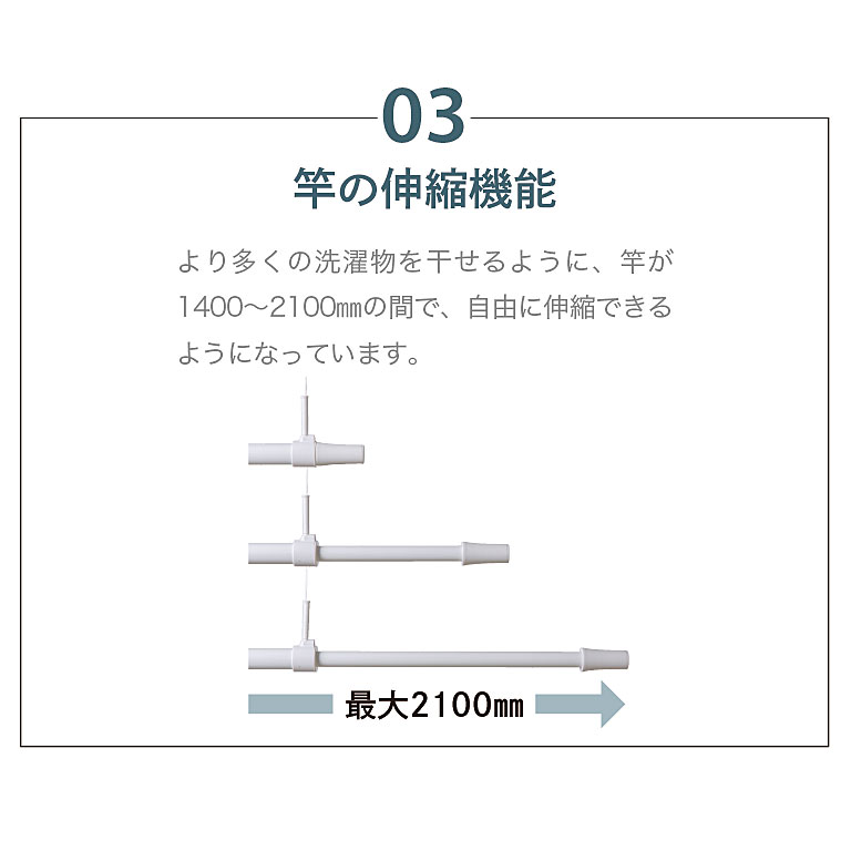 | サイズ | 横幅139.4cm×奥行9.7cm×高さ14.2〜120cm 竿長さ:140〜210cm |
