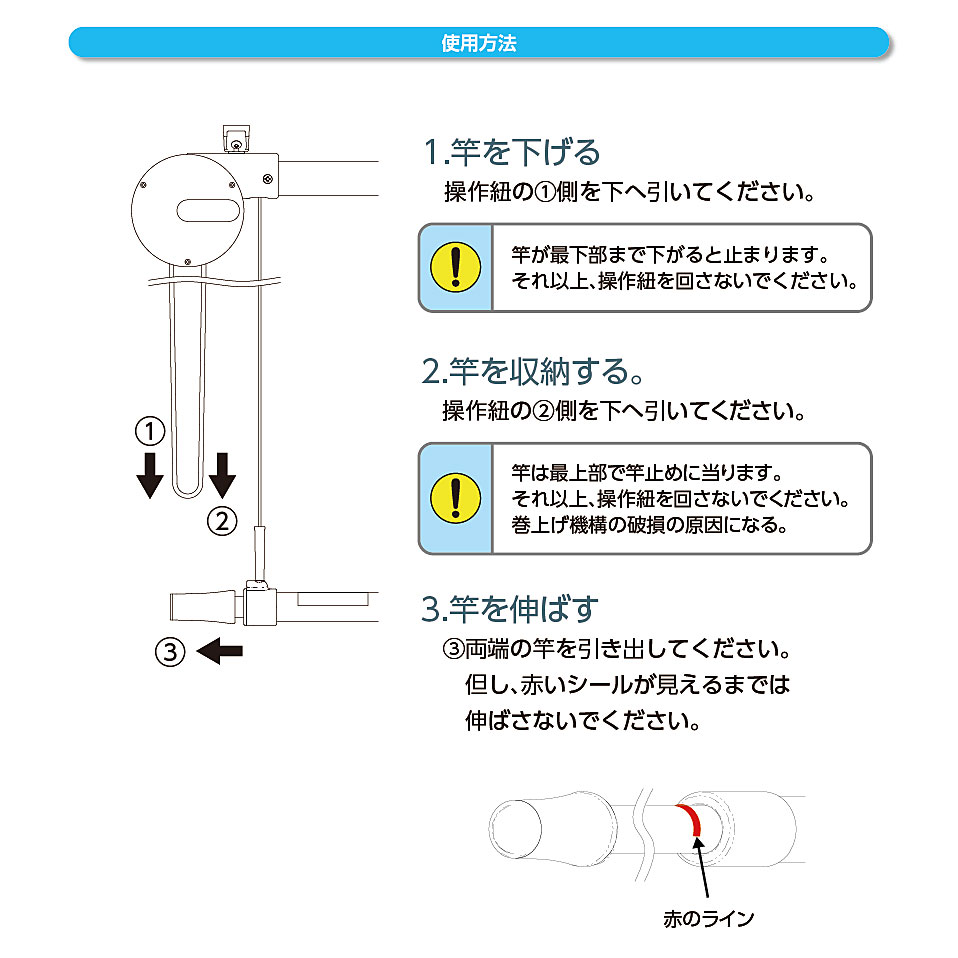 ●室内やテラス囲いの天井に取付けて、天井から14.2〜120cmの間で、使いやすい高さに竿を昇降して洗濯物を干せる物干金物です。