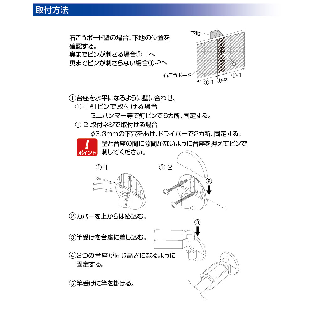 ●壁材を確認して、下地がない場合は付属のピンで壁に設置します。下地がある場合は付属のネジをお使いください。