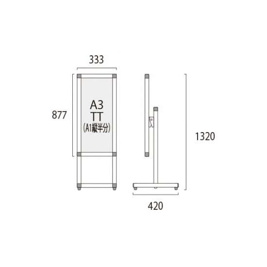■製品仕様●パネル・本体=アルミ押出し材/アルマイト仕上(ブラック)●脚部=縦パイプ/アルミ押出し材/アルマイト仕上(ブラック) 横パイプ/ステンレスパイプ #400(シルバー)※ブラックシリーズの脚部横パイプはシルバーです。●面板=アルミ複合板(白)3mm厚●表面カバー=アクリル 透明1.5mm厚●面板有効サイズ=W281mm×H825mm●対応メディアサイズ=A3TT(W297mm×H841mm)●重量=5.7kg※屋内・屋外可(ポスターには耐水加工が必要です)