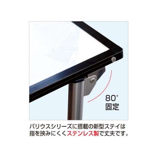 ■製品仕様●パネル・本体=アルミ押出し材/アルマイト仕上(ブラック)●脚部=縦パイプ/アルミ押出し材/アルマイト仕上(ブラック) 横パイプ/ステンレスパイプ #400(シルバー)※ブラックシリーズの脚部横パイプはシルバーです。●面板=アルミ複合板(白) 3mm厚●表面カバー=アクリル 透明1.5mm厚●面板有効サイズ=W578mm×H404mm●対応メディアサイズ=A2横(W594mm×H420mm)●重量=5.3kg※屋内・屋外可(ポスターには耐水加工が必要です)