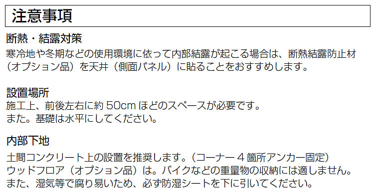 ・お客様組立品です。組立の際は複数人で行ってください。 ・固定用ボルト、床板は付属していません。 ・ベースサイズ:横幅150cm×奥行280cm ・ベース面積:4.04㎡(1.22坪) ・ドアロックバー機能、2段吊り棚付き ・寒冷地や冬期などの使用環境によって内部結露がおこる場合は、断熱結露防止剤(オプション品)を天井(側面パネル)に貼ることをおすすめします。 ・施工上、前後左右に約50cm程のスペースが必要です。 ・基礎は水平にしてください。 ・土間コンクリート上の設置を推奨します。(コーナー4箇所アンカー固定)ウッドフロア(オプション品)は、バイクなどの重量物の収納には適しません。また、湿気等で腐りやすいため、必ず防湿シートを下に敷いてください。 ・4t車での配送となる為、4t車の侵入不可の場合は配送できませんのでご了承ください。 ・施工、組立は行っておりませんのでご了承ください。 ・お近くの施工業者を探されたい方は、費用を把握したい方は『無料・匿名』で見積がわかるホームプロをオススメしております。 ・基本的に地上1階でのお渡しとなります。 ※商品の色はPCと異なって見える場合があり、またPCによっても異なります。色がイメージと異なるという理由では返品は承りかねますので、予めご了承ください。 |