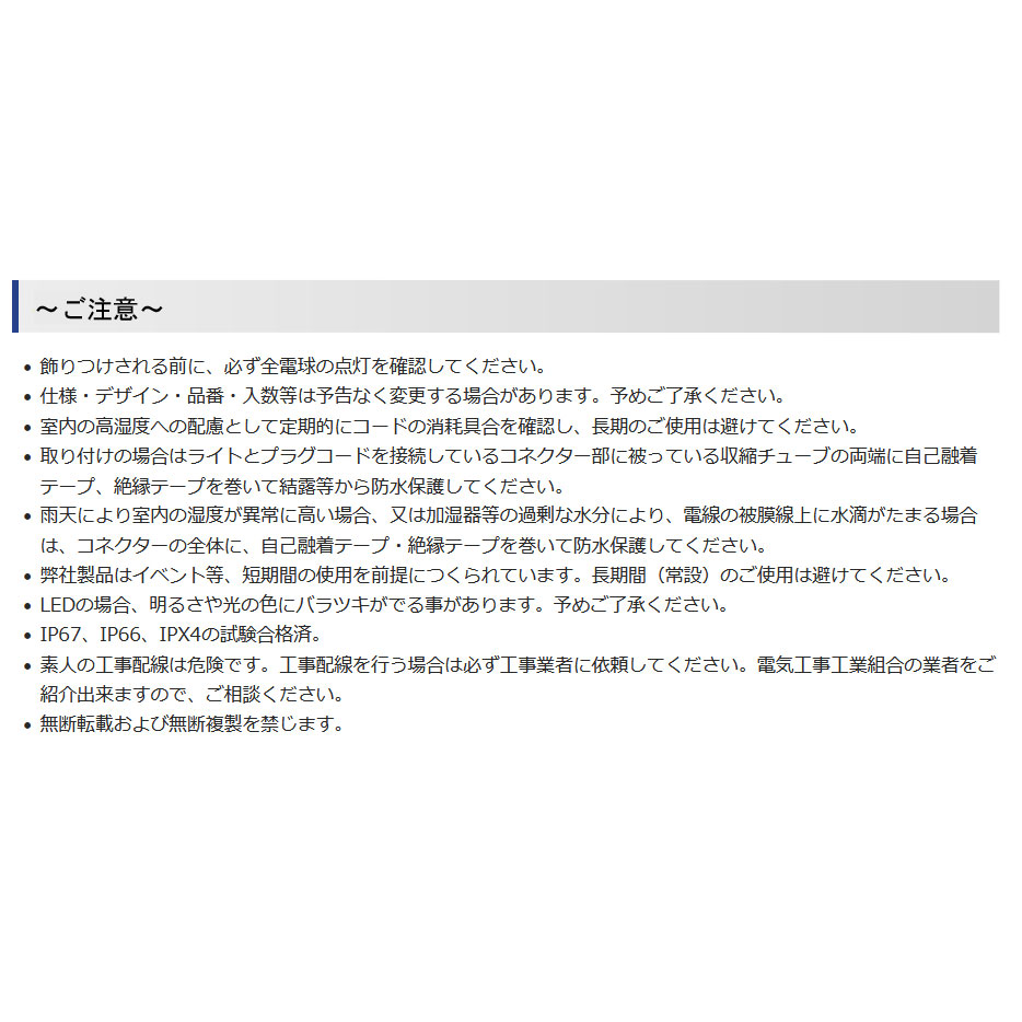 | 備考 | ・LEDカラー:赤 ・防水規格:IPX4 ・LEDチューブライト ・連結コネクター付 ・常点プラグコード180cm付 ・商品の色はPCと異なって見える場合があり、またPCによっても異なります。色がイメージと異なるという理由では返品は承りかねますので、予めご了承ください。 |