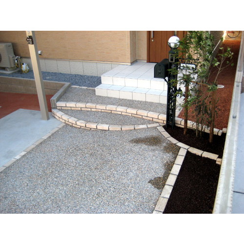 ●雑草防止、水跳ね防止の敷き砂利として。適度な粒度分布と破砕形状のため、飛散しにくい点もメリットです。