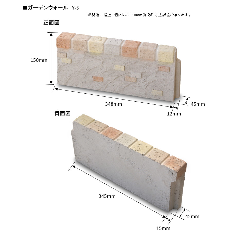 ・接着には「コンクリート・レンガ接着剤 ナルシルバー」がお勧めです。 ・「Y-S(ストレート)」と「Y-C(コーナー)」がセットになった「ガーデンウォール セット」も御座います。 ・サイズ、色、形状、重量には幅がありますのでご了承願います。 ・外保管品のため、お届け時には雨による濡れや汚れ、若干の欠け、塗装のはがれなどがございます。 ・寒冷地で凍結・融解を頻繁に繰り返す場所では凍害による割れ・ヒビが起きる場合がございます。 ・コンクリート製品全般で起きうる白華現象につきましては補償致しかねますので、水分の多い場所などでは施工方法にご留意下さい。 ・装飾用としての強度設計のため、重量物を置いたり、人や車が乗る等のご使用は避けて下さい。 ・コンクリート製品のため、若干の「欠け」や「こすれ跡」がございます。 ・裏面に装飾はありません。 ・商品の色はPCと異なって見える場合があり、またPCによっても異なります。色がイメージと異なるという理由では返品は承りかねますので、予めご了承ください。 |