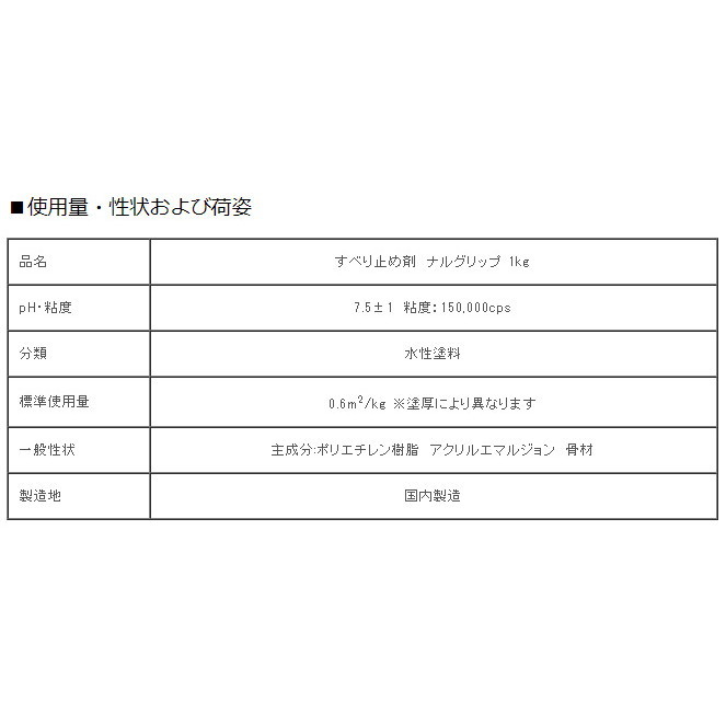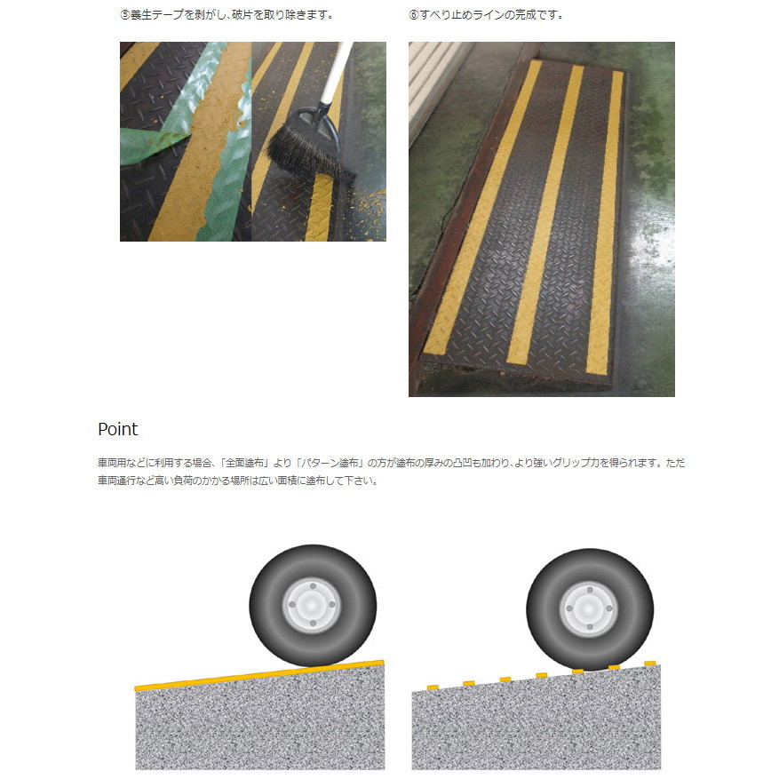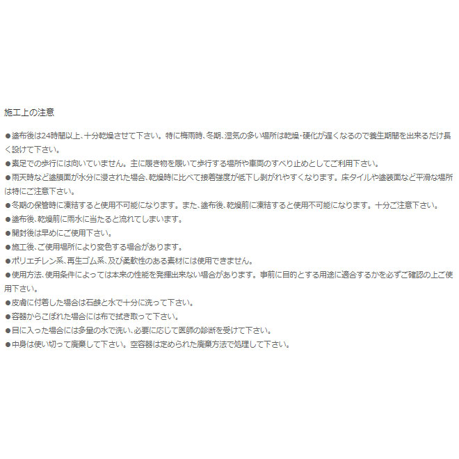 ・滑り抵抗係数(CSR)平均値:0.83(準拠規格 JIS A 1454:2010) ・塗布後は24時間以上、十分乾燥させて下さい。特に梅雨時、冬期、湿気の多い場所は乾燥・硬化が遅くなるので養生期間を出来るだけ長く設けて下さい。 ・素足での歩行には向いていません。主に履き物を履いて歩行する場所や車両のすべり止めとしてご利用下さい。 ・雨天時など塗膜面が水分に浸された場合、乾燥時に比べて接着強度が低下し剥がれやすくなります。床タイルや塗装面など平滑な場所は特にご注意下さい。 ・冬期の保管時に凍結すると使用不可能になります。また、塗布後、乾燥前に凍結すると使用不可能になります。十分ご注意下さい。 ・塗布後、乾燥前に雨水に当たると流れてしまいます。 ・開封後は早めにご使用下さい。 ・施工後、ご使用場所により変色する場合があります。 ・ポリエチレン系、再生ゴム系、及び柔軟性のある素材には使用できません。 ・使用方法、使用条件によっては本来の性能を発揮出来ない場合があります。事前に目的とする用途に適合するかを必ずご確認の上ご使用下さい。 ・皮膚に付着した場合は石鹸と水で十分に洗って下さい。 ・容器からこぼれた場合には布で拭き取って下さい。 ・目に入った場合には多量の水で洗い、必要に応じて医師の診断を受けて下さい。 ・中身は使い切って廃棄して下さい。空容器は定められた廃棄方法で処理して下さい。 ・商品の色はPCと異なって見える場合があり、またPCによっても異なります。色がイメージと異なるという理由では返品は承りかねますので、予めご了承ください。 |