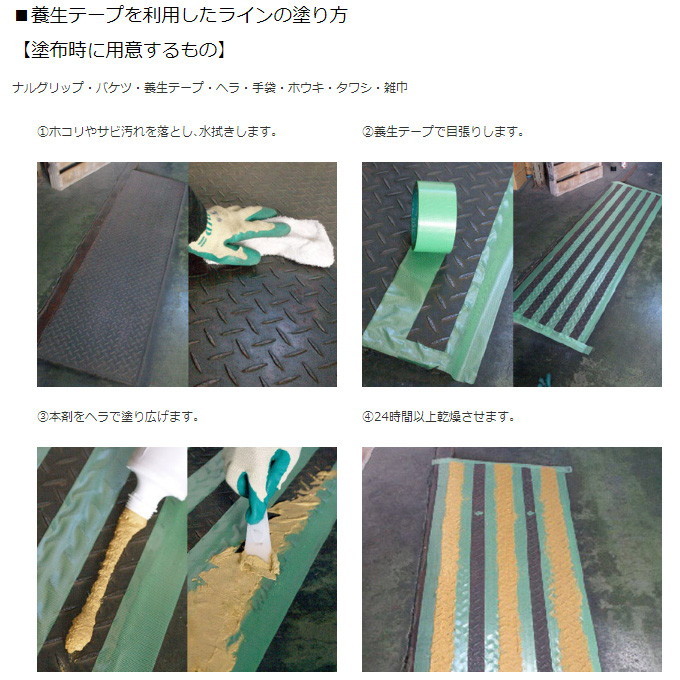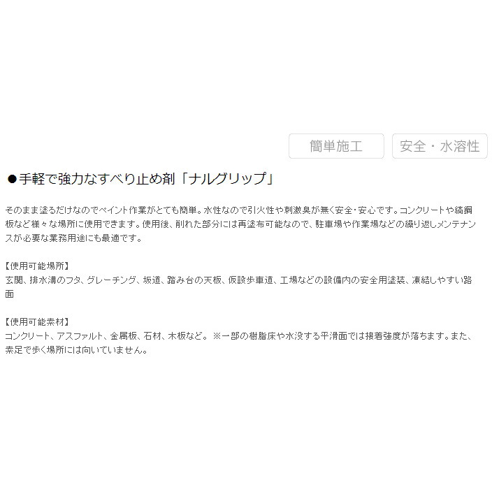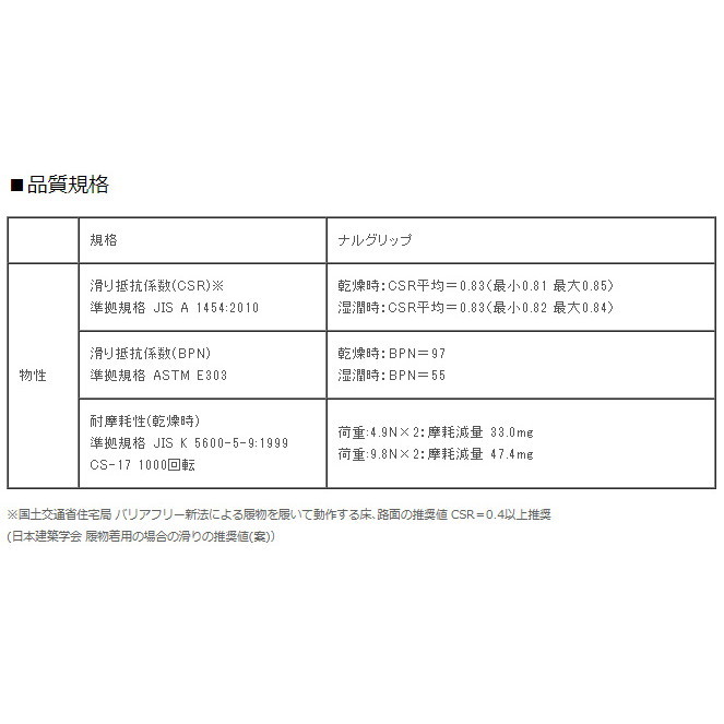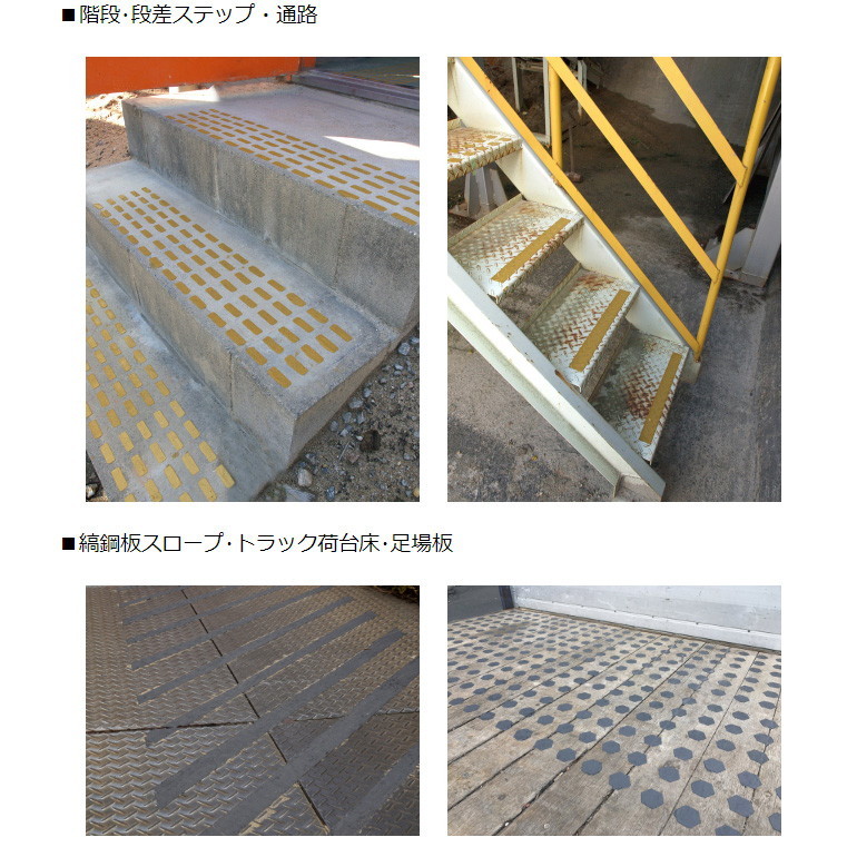 | 使用可能場所 | 玄関、排水溝のフタ、グレーチング、坂道、踏み台の天板、仮設歩車道、工場などの設備内の安全用塗装、凍結しやすい路面 |