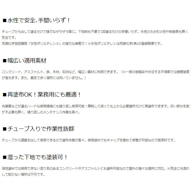 ●そのまま塗るだけなのでペイント作業がとても簡単。水性なので引火性や刺激臭が無く安全・安心です。コンクリートや縞鋼板など様々な場所に使用できます。使用後、削れた部分には再塗布可能なので、駐車場や作業場などの繰り返しメンテナンスが必要な業務用途にも最適です。
