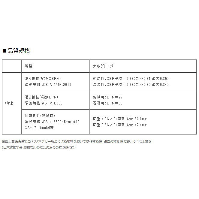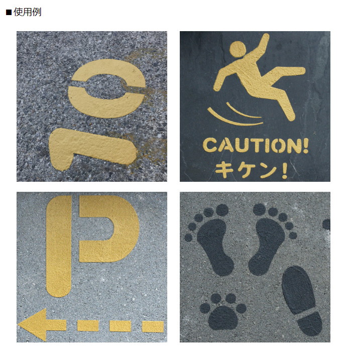 | 使用可能場所 | 玄関、排水溝のフタ、グレーチング、坂道、踏み台の天板、仮設歩車道、工場などの設備内の安全用塗装、凍結しやすい路面 |