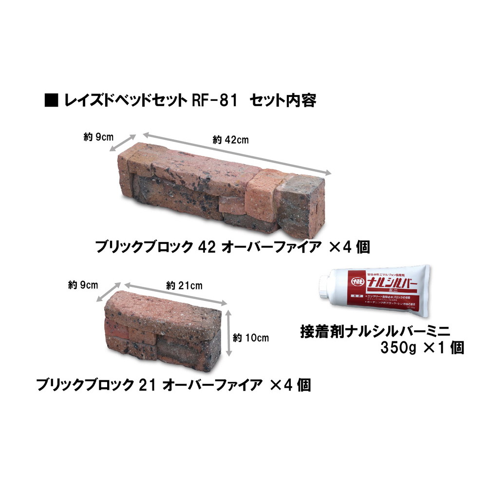 | セット内容 | ブリックブロック21 オーバーファイア×4個(1個約幅21×奥行9×高さ10cm) ブリックブロック42 オーバーファイア×4個(1個約幅42×奥行9×高さ10cm) 接着剤ナノシルバーミニ350g×1個