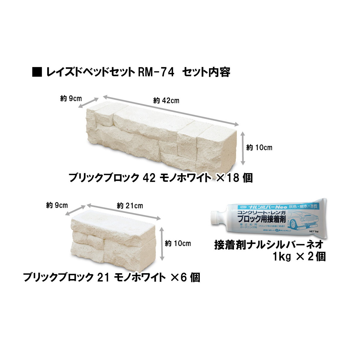 | セット内容 | ブリックブロック21 モノホワイト×6個(1個約幅21×奥行9×高さ10cm) ブリックブロック42 モノホワイト×18個(1個約幅42×奥行9×高さ10cm) 接着剤ナノシルバーネオ1kg×1個