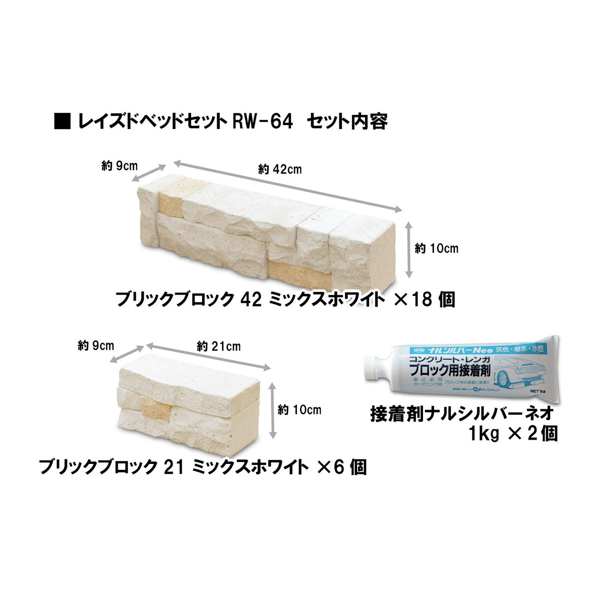 | セット内容 | ブリックブロック21 ミックスホワイト×6個(1個約幅21×奥行9×高さ10cm) ブリックブロック42 ミックスホワイト×18個(1個約幅42×奥行9×高さ10cm) 接着剤ナノシルバーネオ1kg×1個
