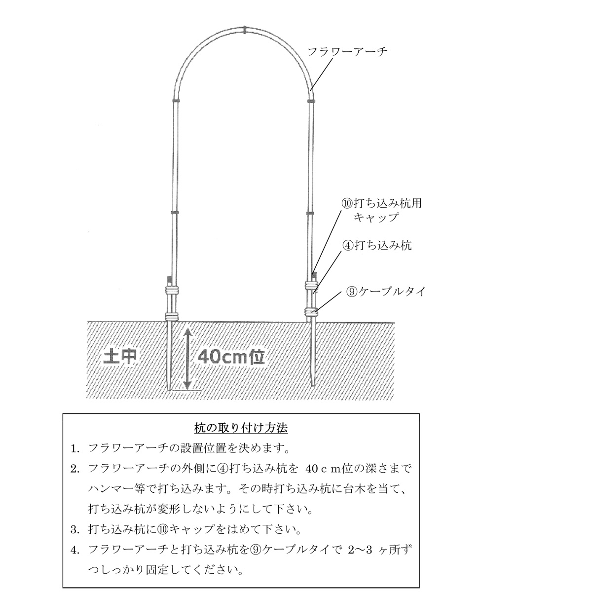 ●設置は付属の角パイプ製長さ70cmの杭が4本付属されていますのでその杭を打ち込んでナイロンケーブルタイ(12本付属)で結束します。(杭は土中に打ち込むタイプです。コンクリートへは打ち込めません)