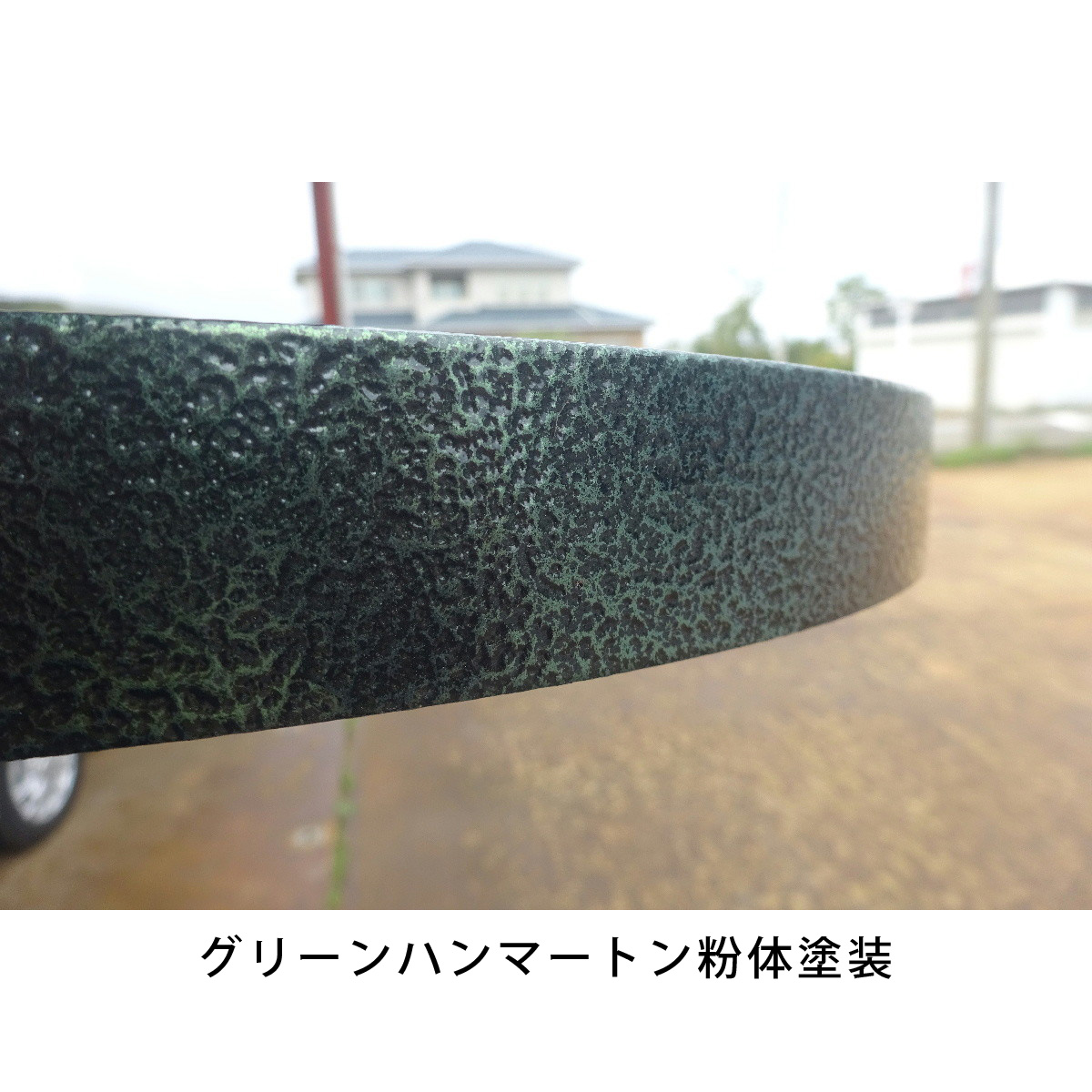 | 材質 | 本体:鉄丸パイプ直径22.2mm、鉄板、鉄丸棒、二重焼付塗装 下塗り/黒カチオン電着塗装 上塗り/グリーン色 ハンマートン粉体塗装仕上げ ネジはドブメッキ |