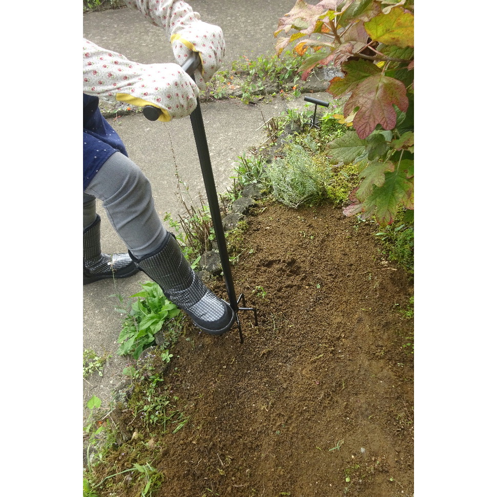 使い方 ハンドルを両手で持ち、爪の上部を足で踏みつけて爪を土に差し込んで下さい。 最後にハンドルを廻して下さい。 抜くときは下の土を上に出すように斜めにして抜いて下さい。 そうすると上と下の土が混ざって、やわらかな土になります。