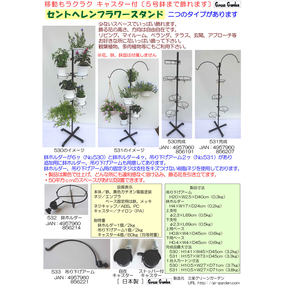 | 耐荷重 | 鉢ホルダー:2kg/1個 キャスター:60kg/4個(均等荷重) |