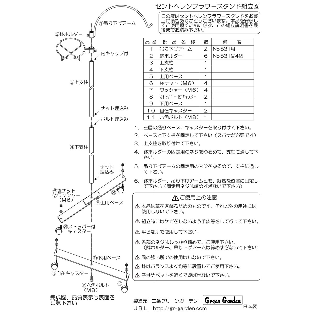 | 耐荷重 | 鉢ホルダー:2kg/1個 吊り下げアーム:2kg/1個 キャスター:60kg/4個(均等荷重) |