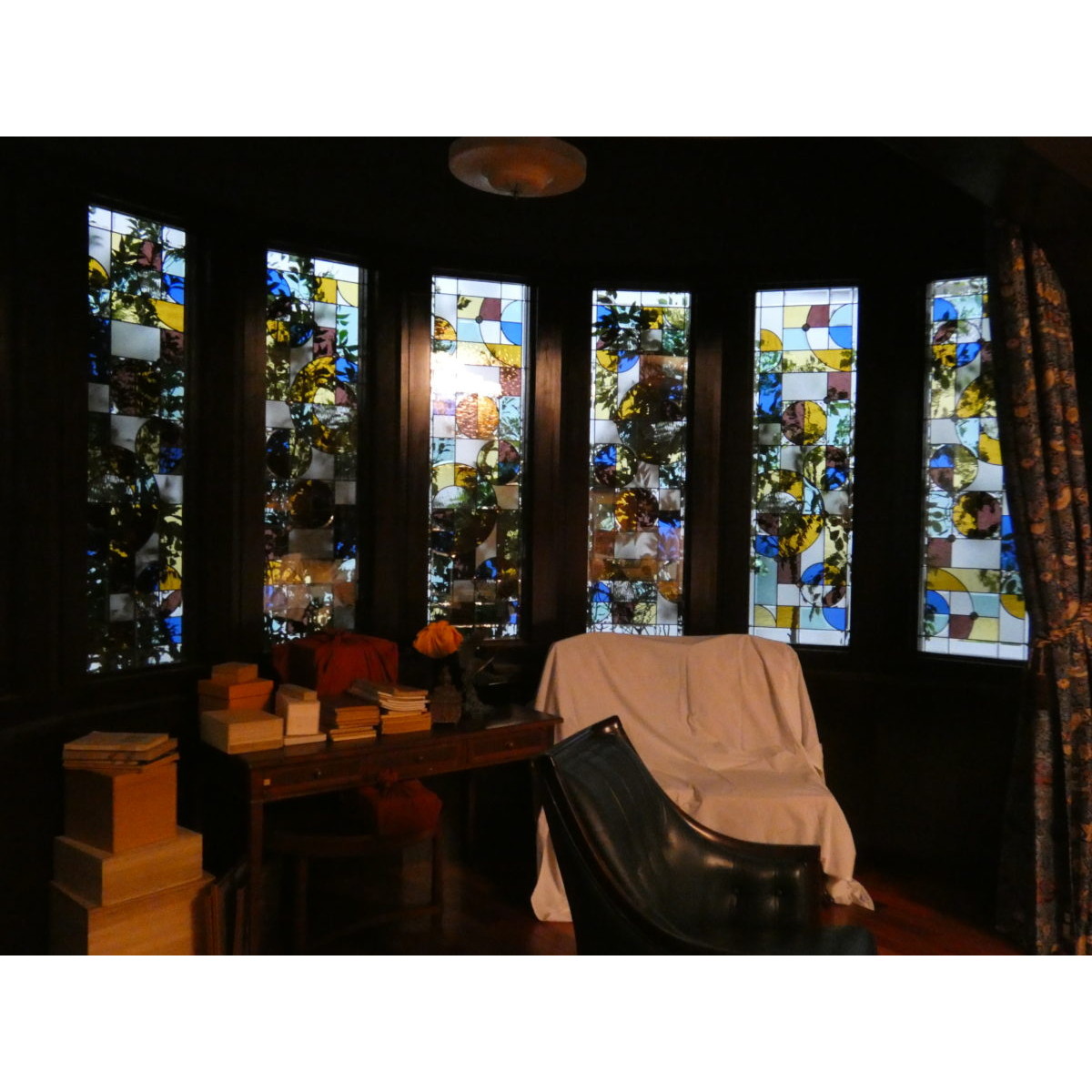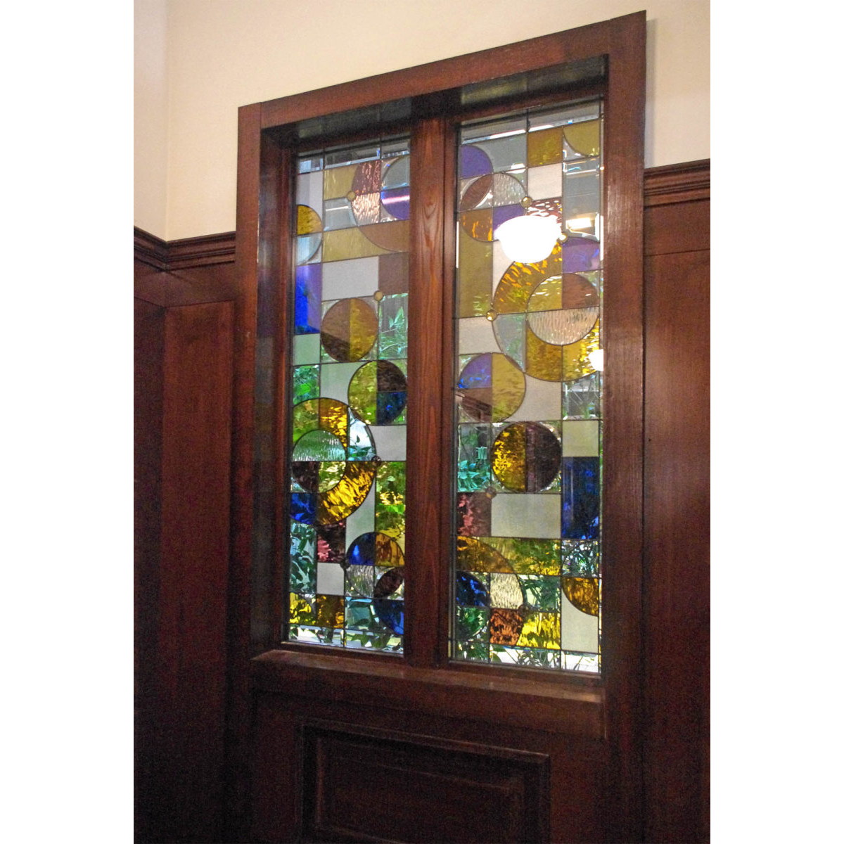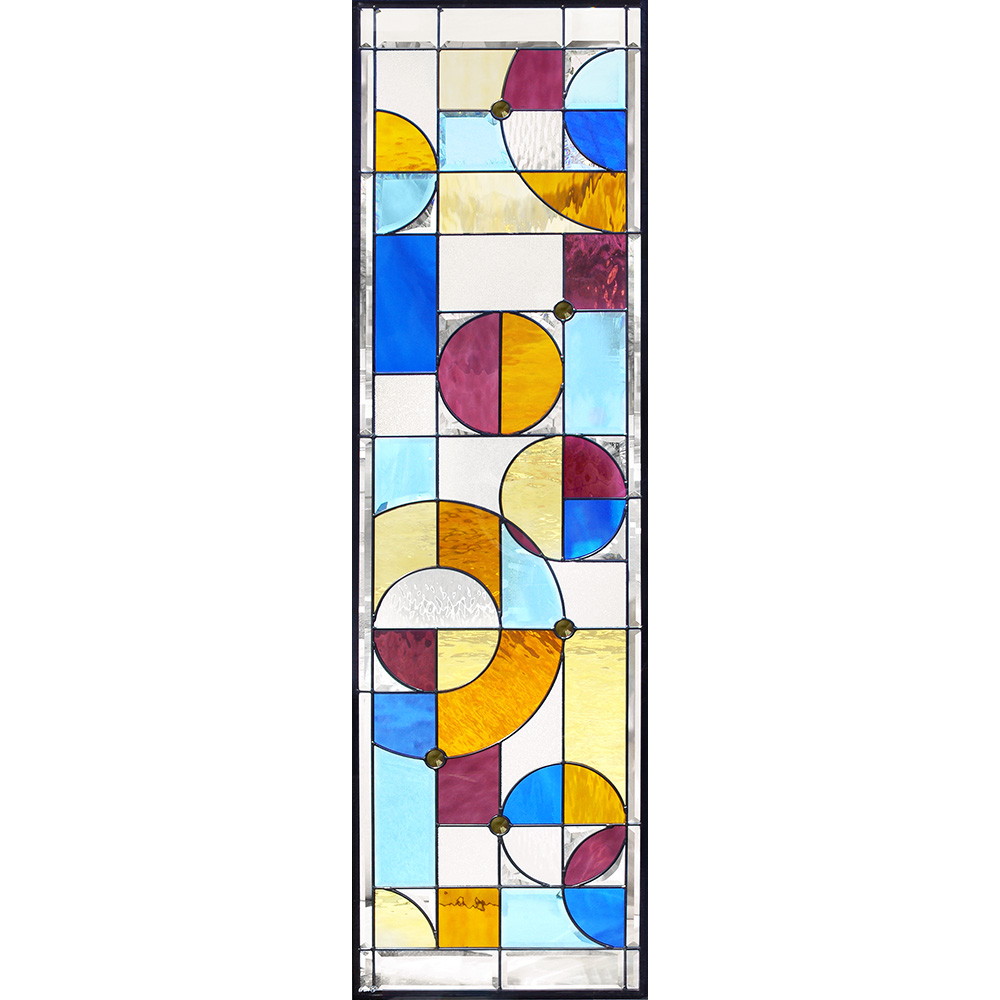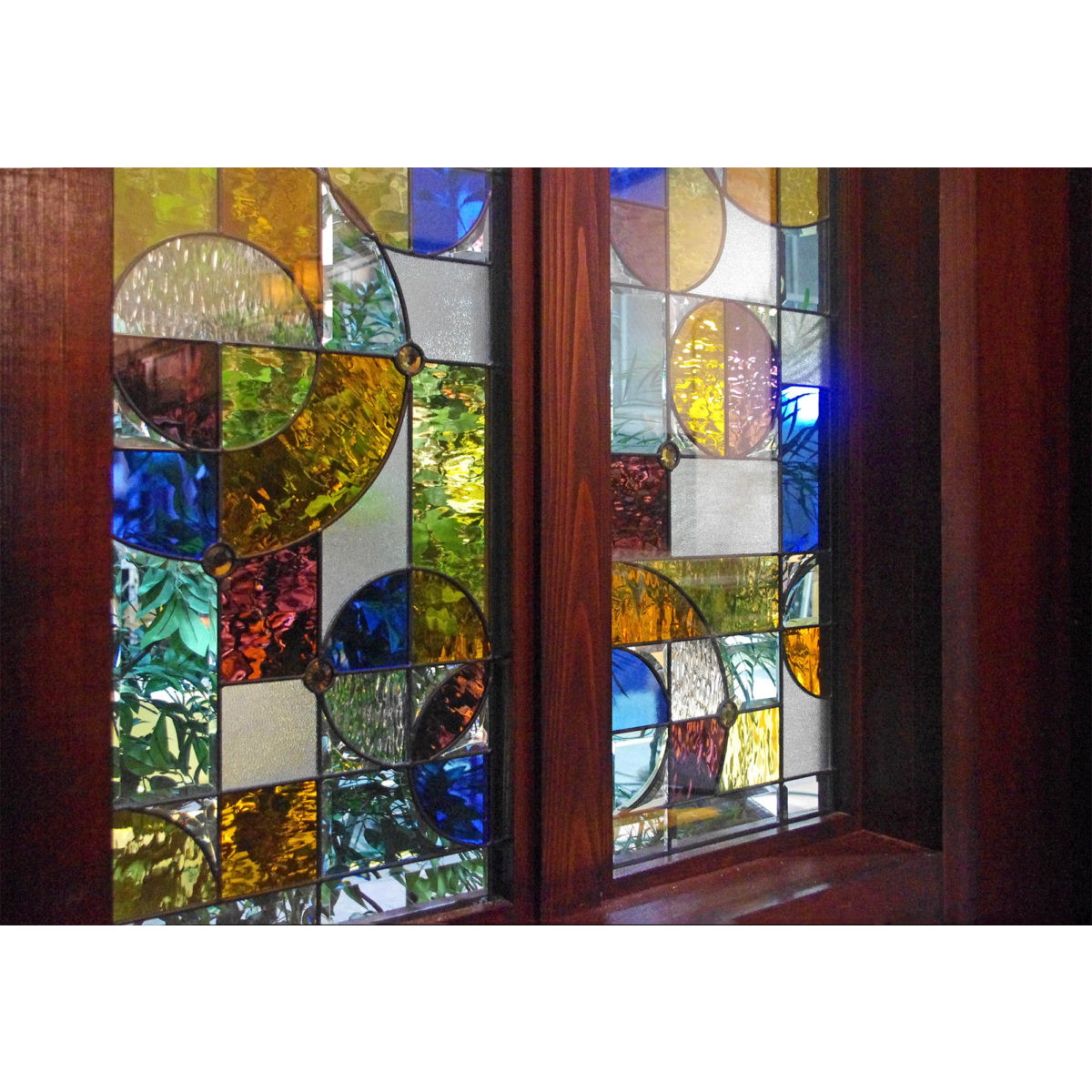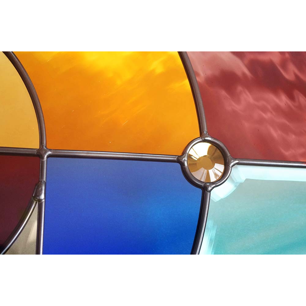 ●鮮やかな色ガラスを目いっぱい使った、ステンドグラスらしい一枚です。光を受けると色とりどりのガラスが爛々と輝き、色豊かな空間を作り出します。