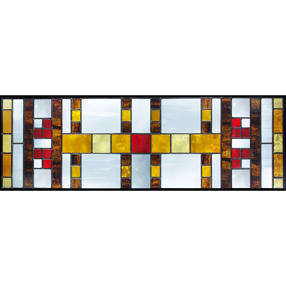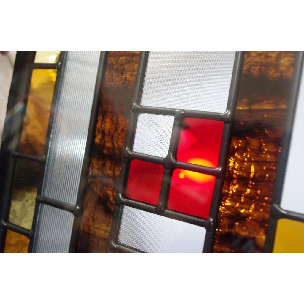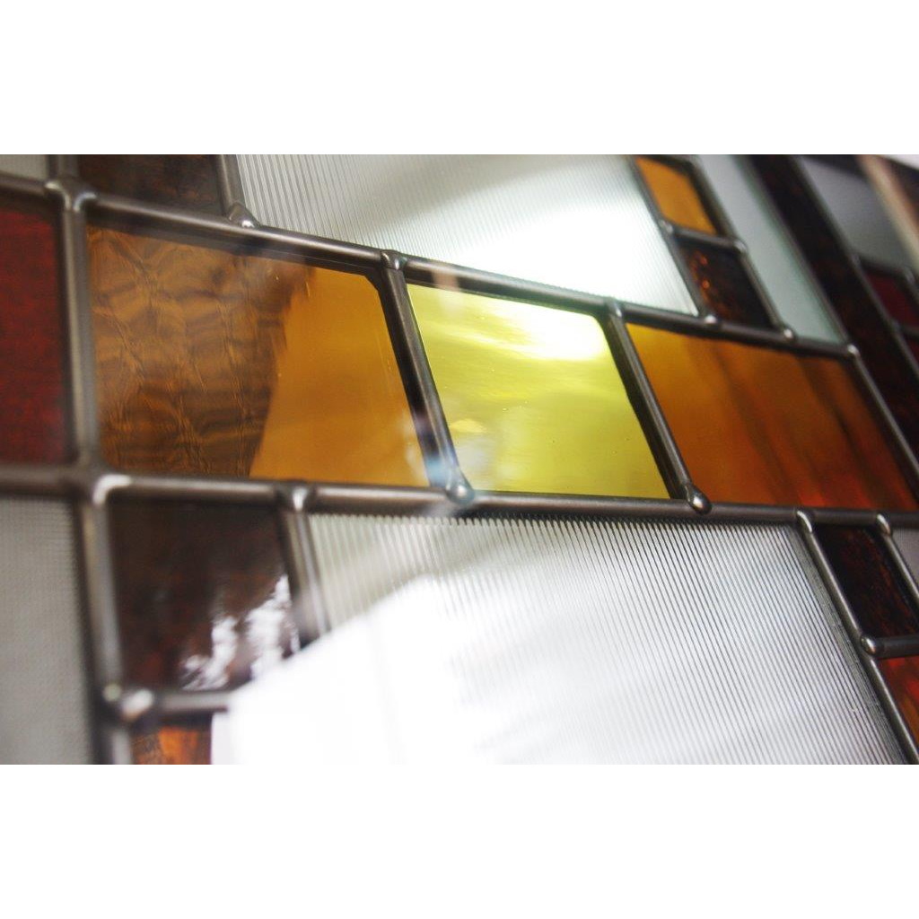 ●幾何学的でシンメトリーな構図と、暖色系のやわらかな色彩がここちよい一枚。茶色のガラスは色の濃淡があり、光の量や角度によって豊かな表情を見せてくれます。