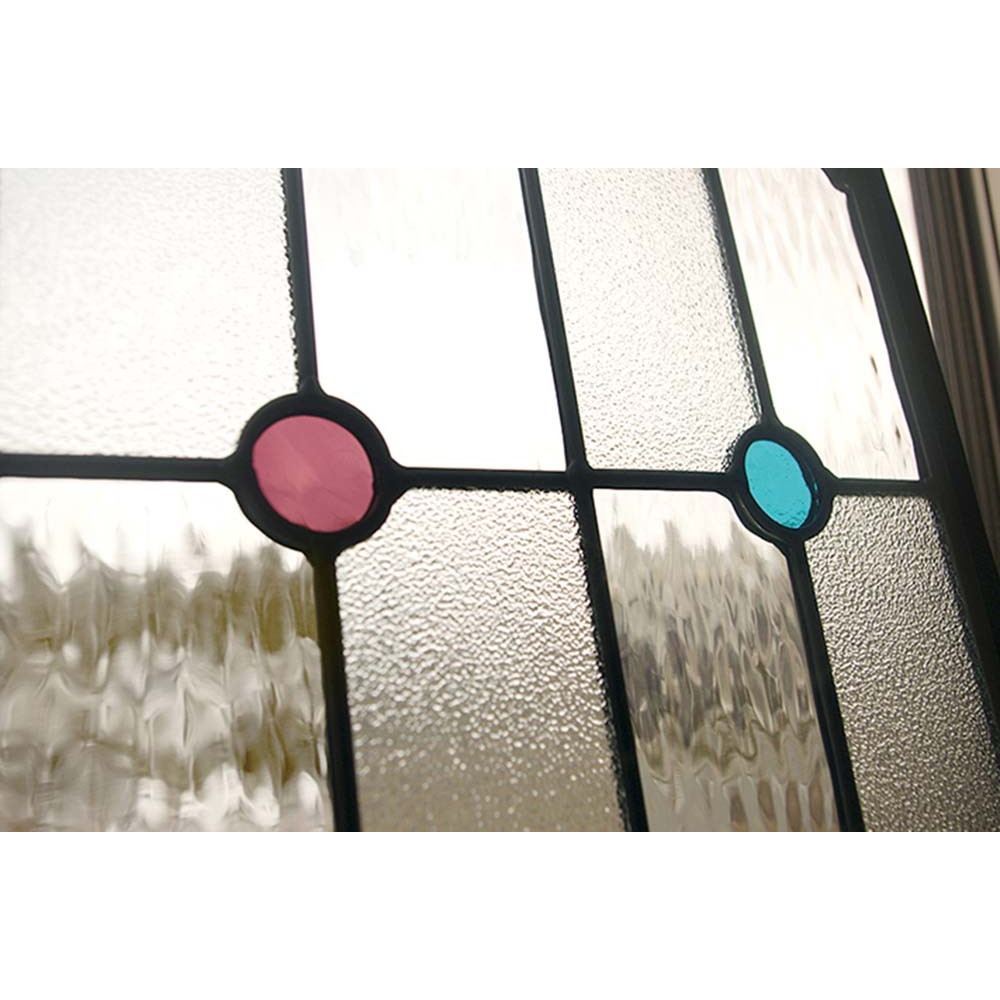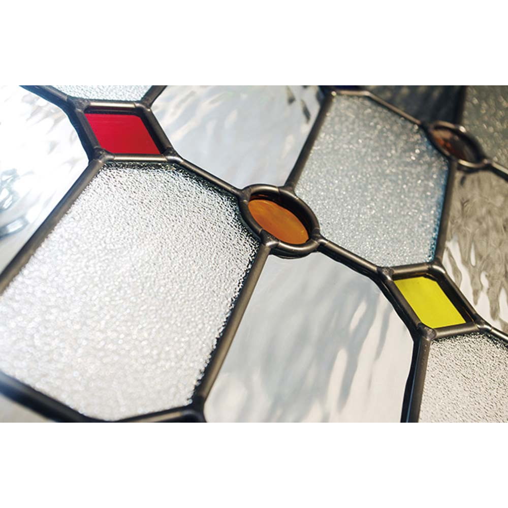 ●計15種類の色ガラスを使った遊び心たっぷりなデザイン。飴玉のような丸やダイヤが可愛らしい一枚です。