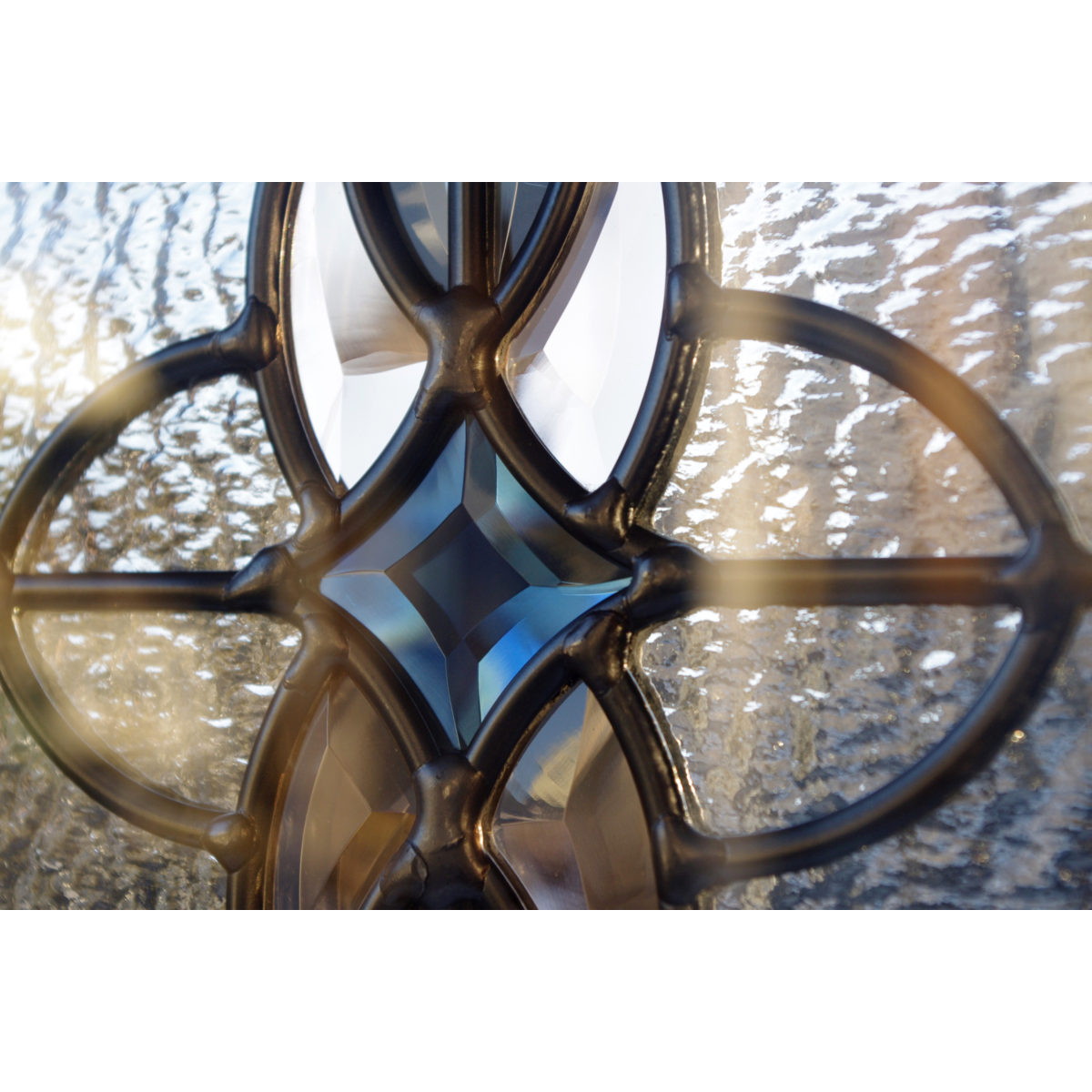 ●黒いジンクケームとグレーの面取りガラスできりっとしまった印象の幾何学デザイン。押さえた色味がシックに空間を飾ります。