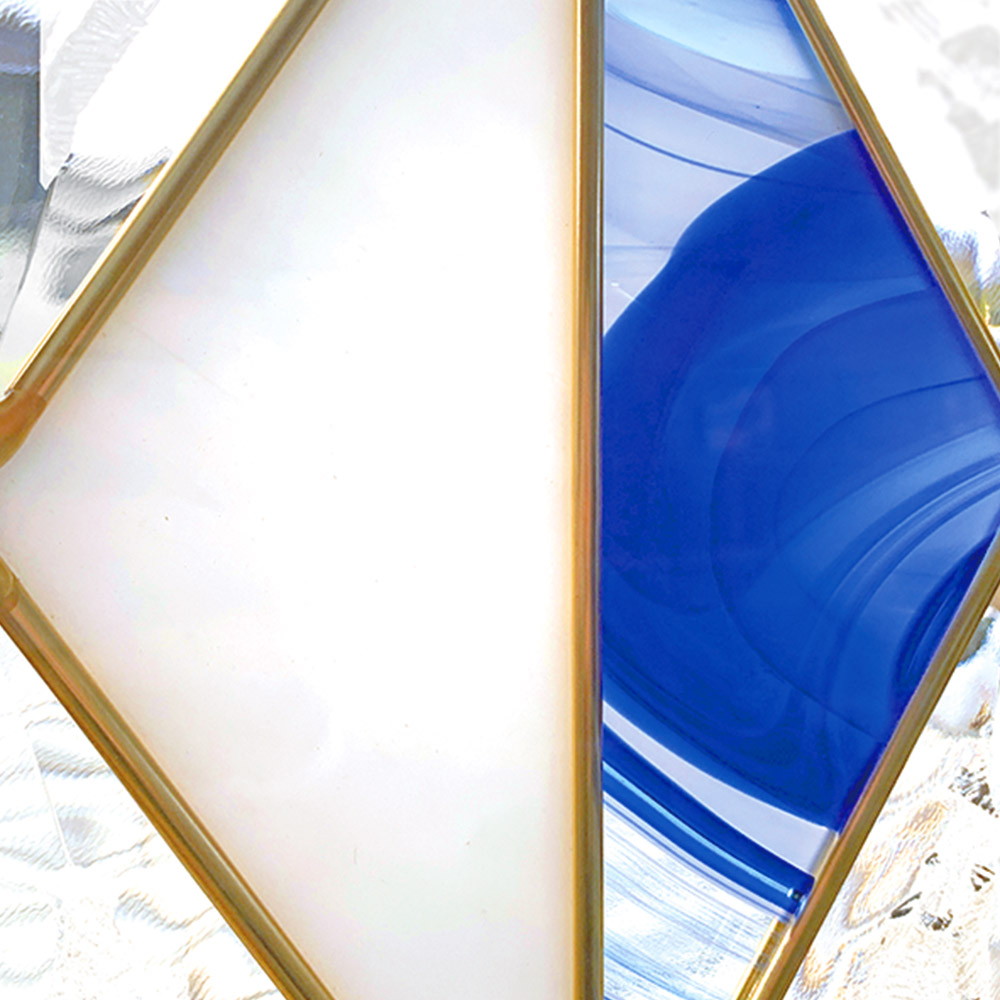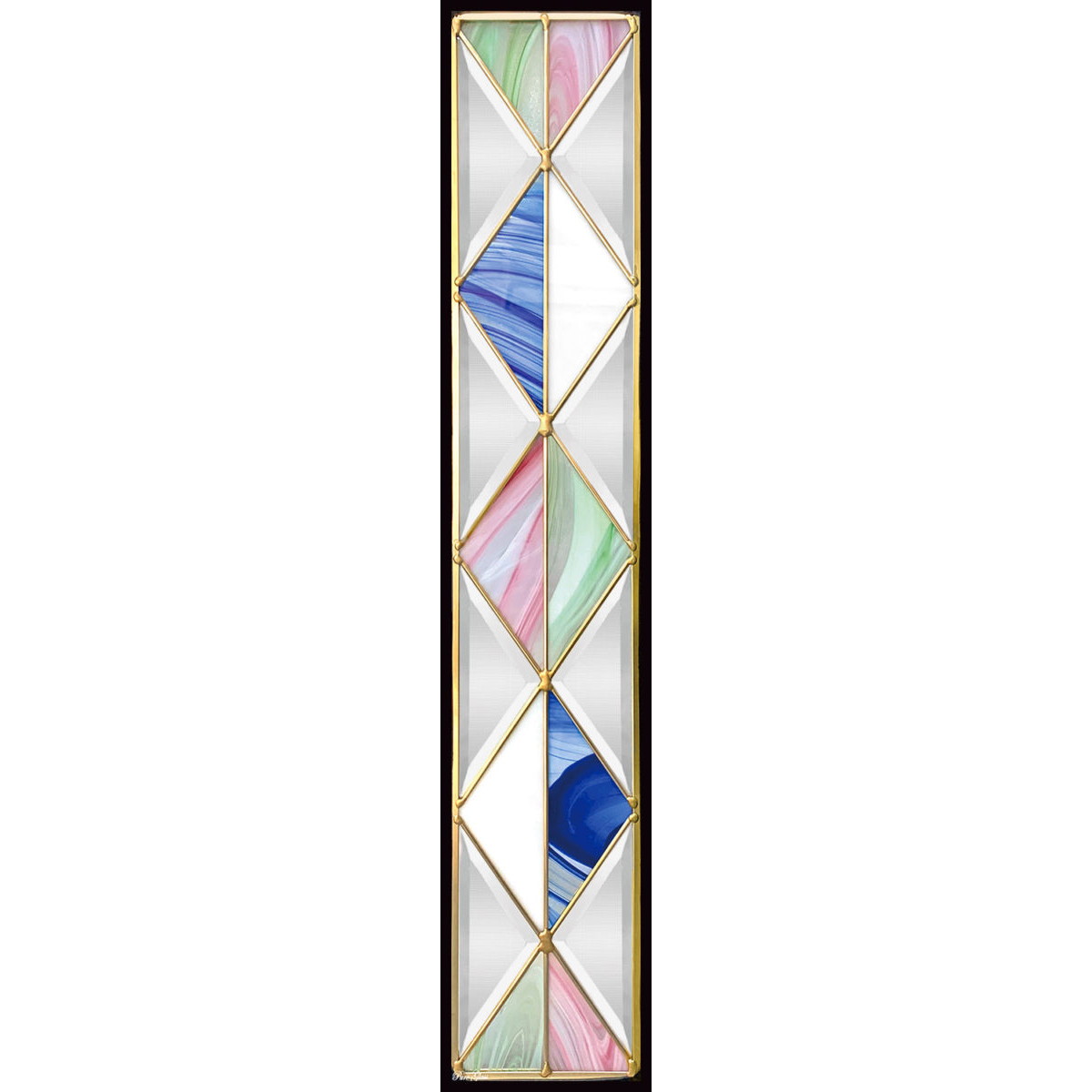 ●シンプルなダイヤ柄に、ピンク・グリーン・ブルーのマーブルガラスと白色ガラスが映える一枚。ゴールドケームが華やかさを引き立てます。