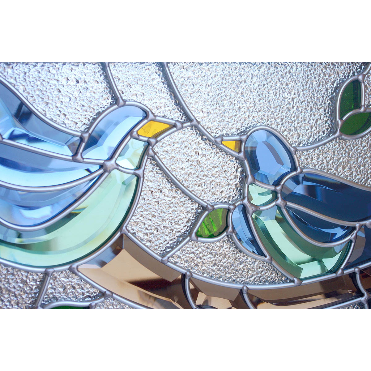 ●幸せの「青い鳥」。チルチルとミチルの兄妹が、最後に我が家で青い鳥を見つけるという童話を表現しています。「幸せの青い鳥」のステンドグラスを見るたびに、日々の幸せに気づかせてくれます。