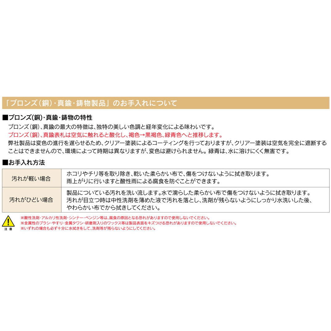 ブロンズメッキ仕上(標準カラー)、硫化イブシ仕上、シルバー塗装仕上、黒塗装仕上、サビ塗装仕上 ※ブロンズメッキ仕上と硫化イブシ仕上は銅・真鍮特有の経年変化がございます。(※空気に触れると酸化する為、早ければ半月~1ヶ月程で変化する場合がございます。) ※サビ塗装仕上にされた場合には、納期が変わります。 ※カラー変更は全体となります。部分的に変更する事はできません。 |