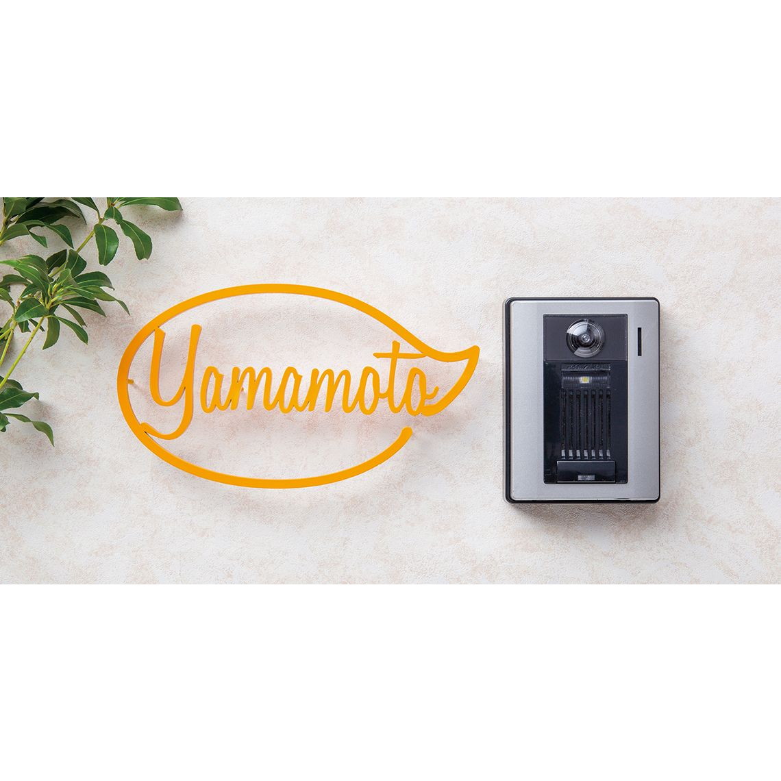 ●ユニークなフォントが特徴的。厚さ5mmのステンレス表札にサンド風テクスチャがアクセント。