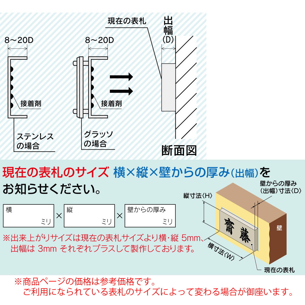 参考サイズ 185W×185H×8〜20D(mm)(現在の表札のサイズによって変わります※要見積) |