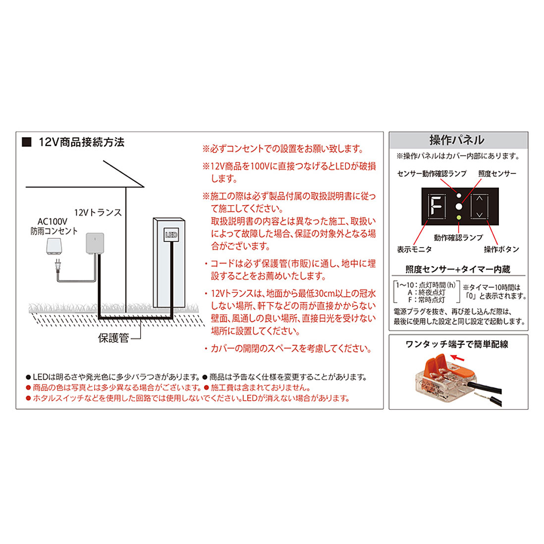 | 備考 | ・DCトランス 15W(最大許容W数 10.5W) ・照度センサー/タイマー機能付き ・センサー:日没点灯/明け方消灯 ・タイマー:日没点灯後1~10時間後消灯 ・最大2分岐可能 ・プラグコード長:0.45M ・商品の色はPCと異なって見える場合があり、またPCによっても異なります。色がイメージと異なるという理由では返品は承りかねますので、予めご了承ください。 |