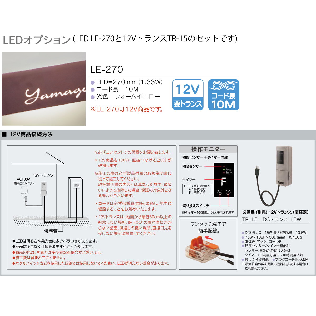 ・左曲げが標準仕様ですが、右曲げへの変更も無料で可能です。 ・文字数が多い場合には価格が変わる場合がございます。(要見積) ・書体や文字の大きさ、形によっては制作できな場合がございます。 ・別売りのLEDライトのLE-270と12V変圧器のTR-15を使用してLEDライトをつける事が可能です。 ・商品の色はPCと異なって見える場合があり、またPCによっても異なります。色がイメージと異なるという理由では返品は承りかねますので、予めご了承ください。 |
