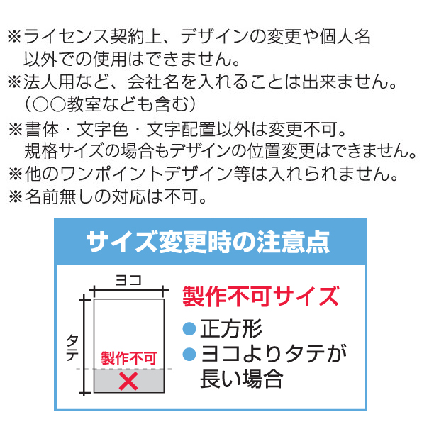 ・名前は個人名以外を入れる事は出来ません。(会社名、○○教室などは不可。無記名も不可) ・イラストを変更する事は出来ません。(位置の変更、サイズの変更など不可) ・文字以外のワンポイントデザインなどを追加で入れる事は出来ません。 ・商品の色はPCと異なって見える場合があり、またPCによっても異なります。色がイメージと異なるという理由では返品は承りかねますので、予めご了承ください。 |