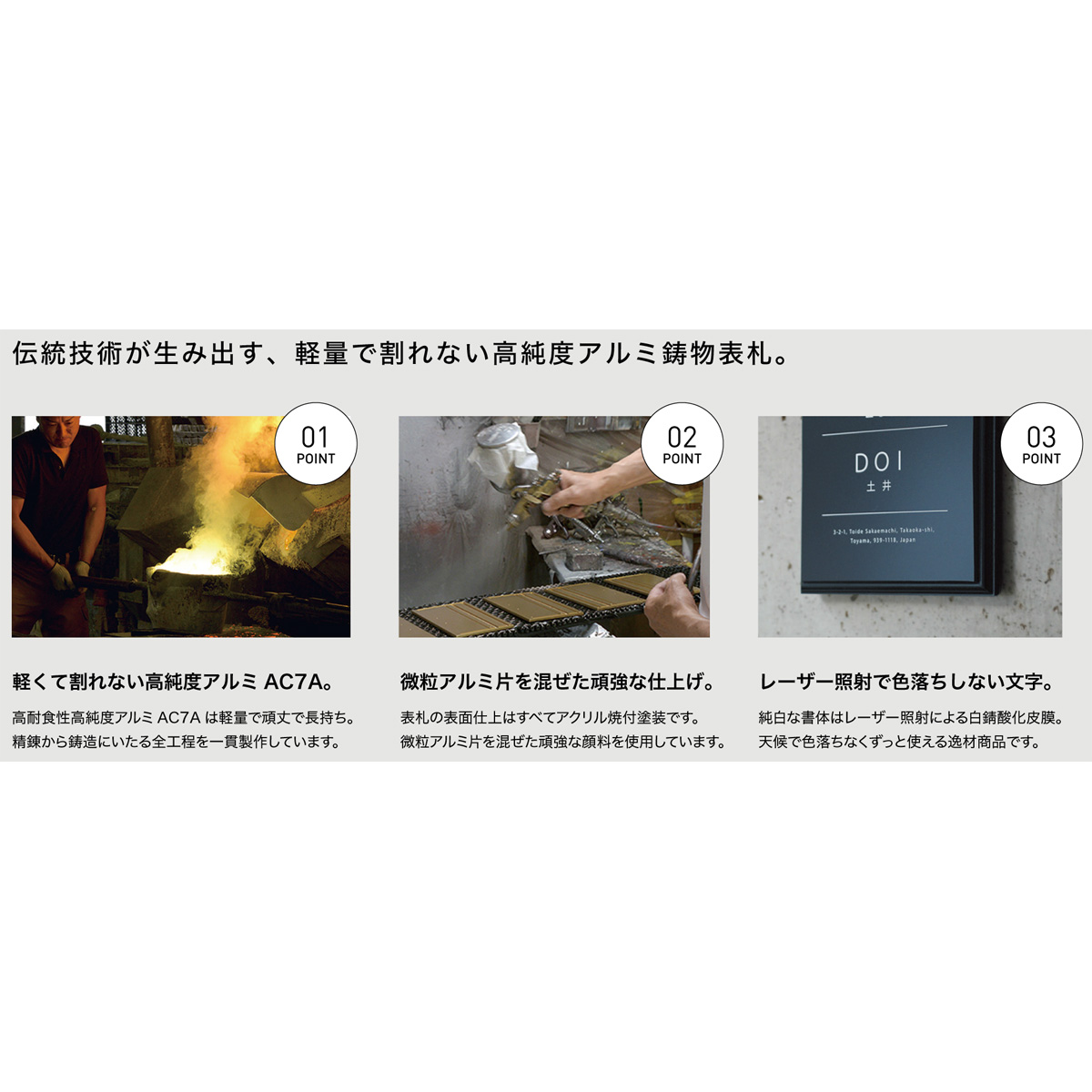●軽量で耐久性に優れたエクステリアの逸材、アルミニウム素材を使った鋳物製表札。鋳物技術の立体的な自由な造形を取り入れ、表面には金属の光沢感と高級感溢れる質感を表現。エントランスのシンボルとして重厚な存在感をお楽しみください。