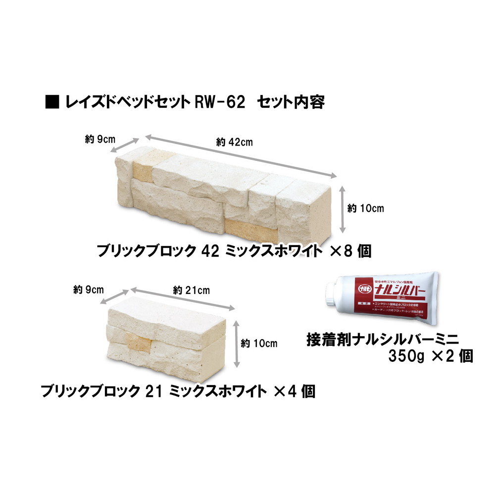 | セット内容 | ブリックブロック21 ミックスホワイト×4個(1個約幅21×奥行9×高さ10cm) ブリックブロック42 ミックスホワイト×8個(1個約幅42×奥行9×高さ10cm) 接着剤ナノシルバーミニ350g×1個
