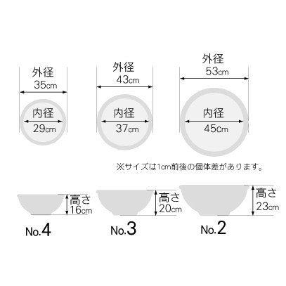 | サイズ | FMB-02:外径約53×高さ約23cm FMB-03:外径約43×高さ約20cm FMB-04:外径約35×高さ約16cm ※サイズは個体差があります。 |
